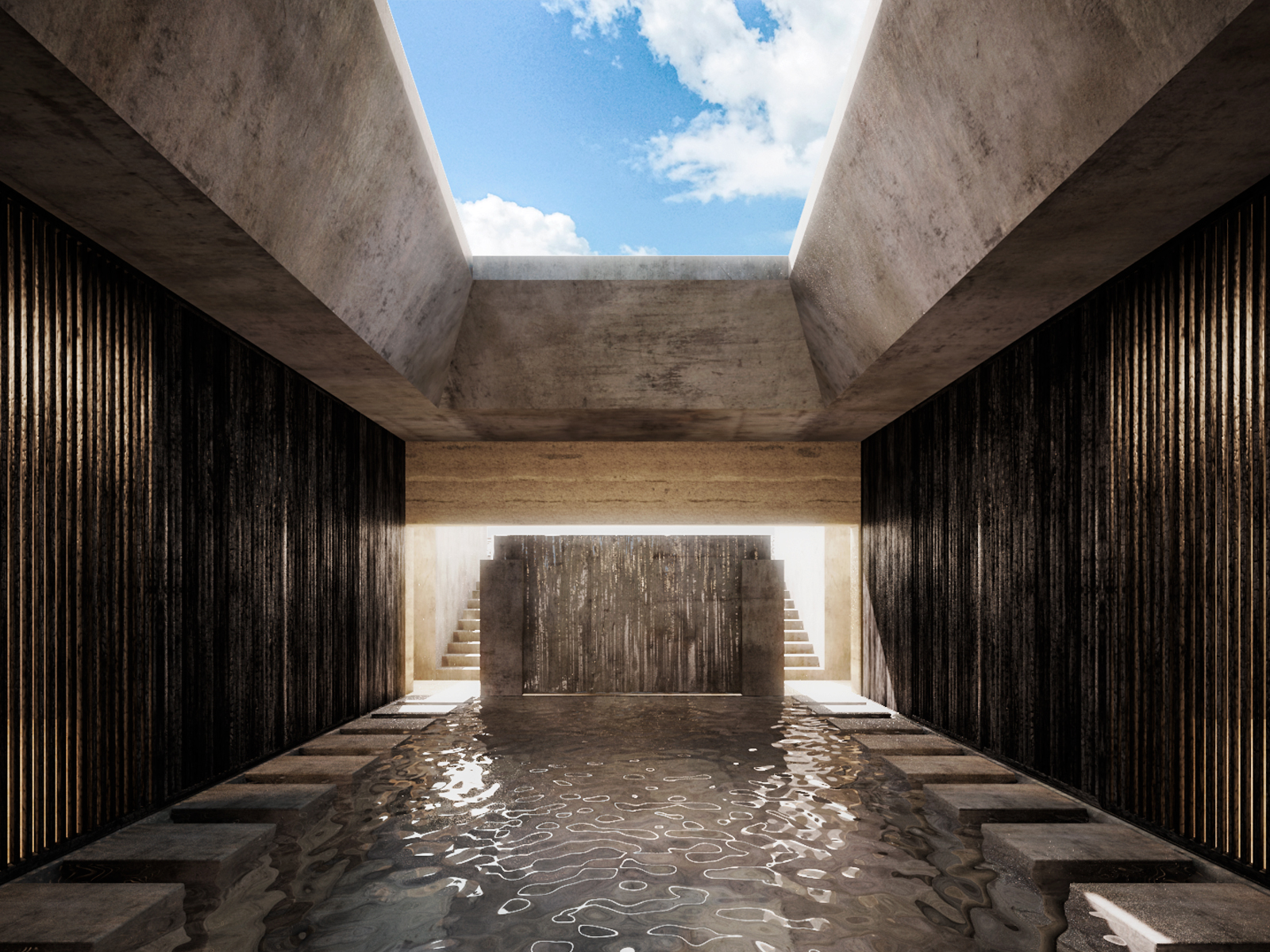 La respuesta fue un diseño de un cuerpo arquitectónico que albergará un canal de nado, el cual tiene una desembocadura en un ojo de agua con bancas perimetrales. Donde alrededor habitan cuatro cuartos de masajes.